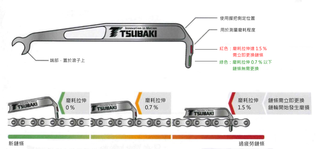 • 經(jīng)常檢測(cè)鏈條磨耗拉伸率,適時(shí)安排保養(yǎng)行程