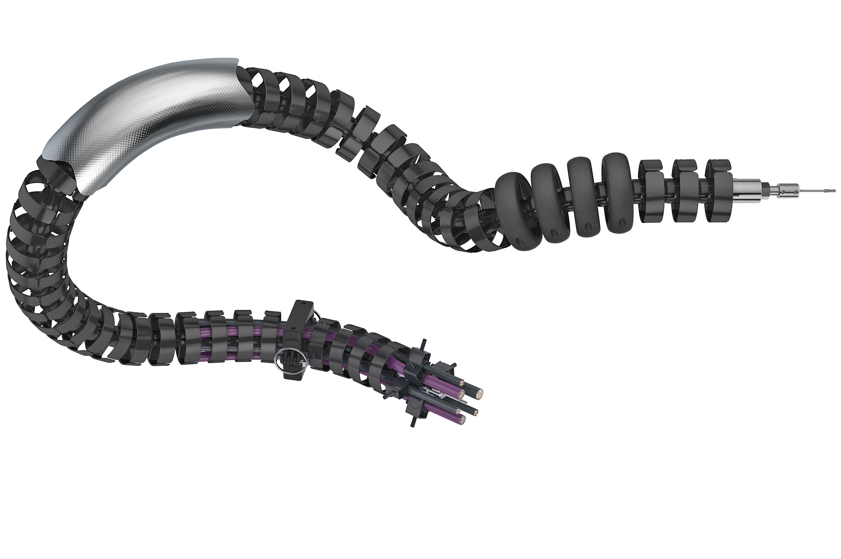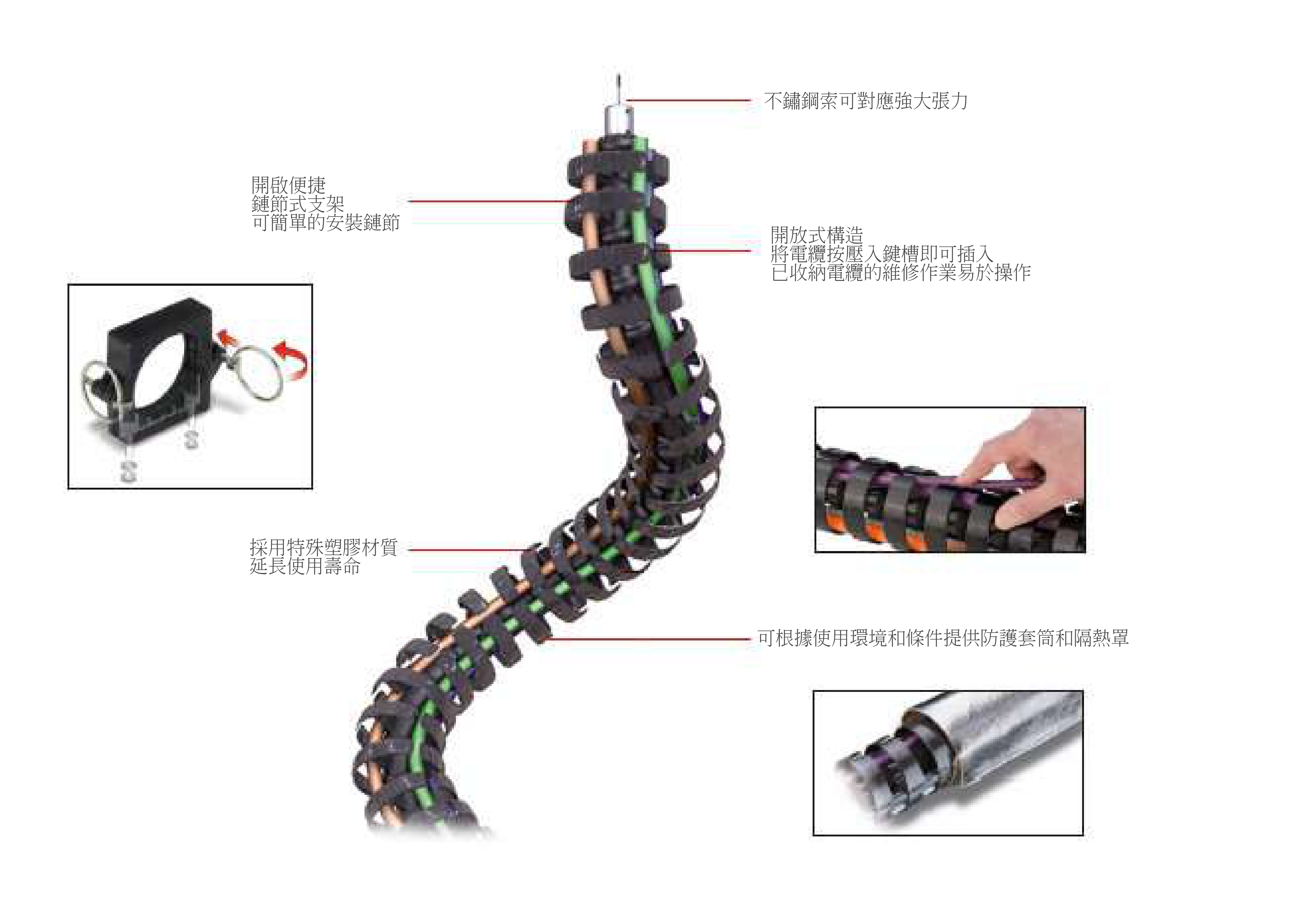工程塑膠製成的鏈節(jié)兩端以球面接頭結構連接,鏈節(jié)中心內建不鏽鋼索,確保強度與靈活性。